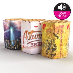 This trio of 19 shot low noise salvos will fill the sky with colour and pretty effects. Splitting Comets fires skyward red and green comet tails rising up before shattering into four stars. Autumn breezes fires shots that break and fall to earth as red and green leaves. Waterfall launches golden stars that break into a beautiful brocade horsetail.